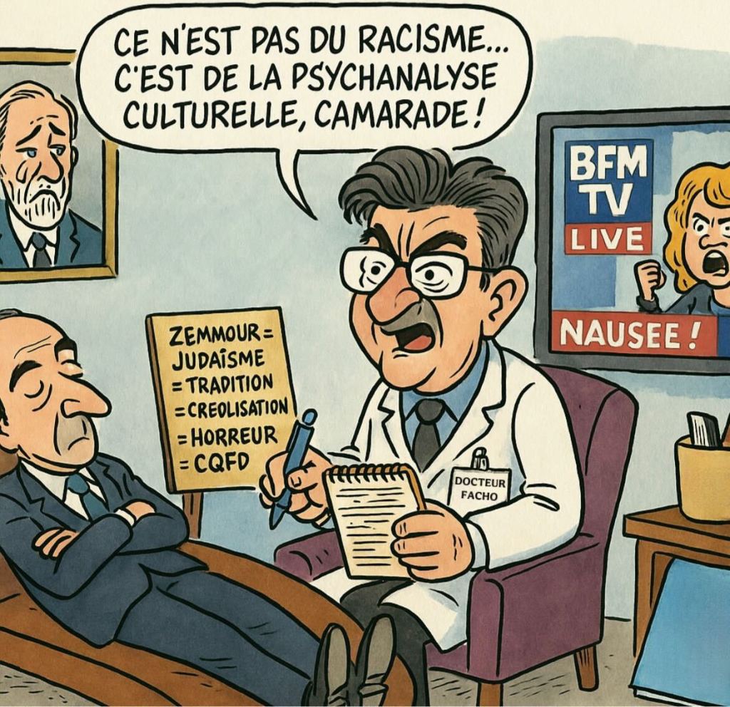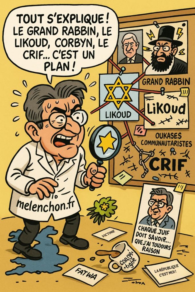 Devant le tollé, le tribun remonte sur BFMTV pour sortir l’indignation calibrée : « chaque Juif doit savoir que s’il est mis en cause parce qu’il est juif, il me trouvera à ses côtés ». Traduction : il aime les Juifs, mais seulement les silencieux. Puis, parce qu’un bon billet mérite une fin à la hauteur, il compare la critique du grand rabbin à une fatwa venue du Caire. Digne d’une conférence sur le complotisme en free jazz.