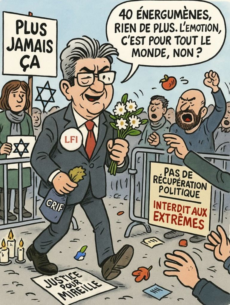 Mélenchon, fidèle à son style de minimisation tranquille, réduira l’événement à un « épiphénomène » causé par « 40 énergumènes ». Parce qu’apparemment, quand on se fait jeter d’une marche contre l’antisémitisme par ceux-là mêmes qu’on prétend soutenir, c’est juste une péripétie. Le message envoyé à la communauté juive ? « Votre douleur, vos règles. Mais je viens quand même. »