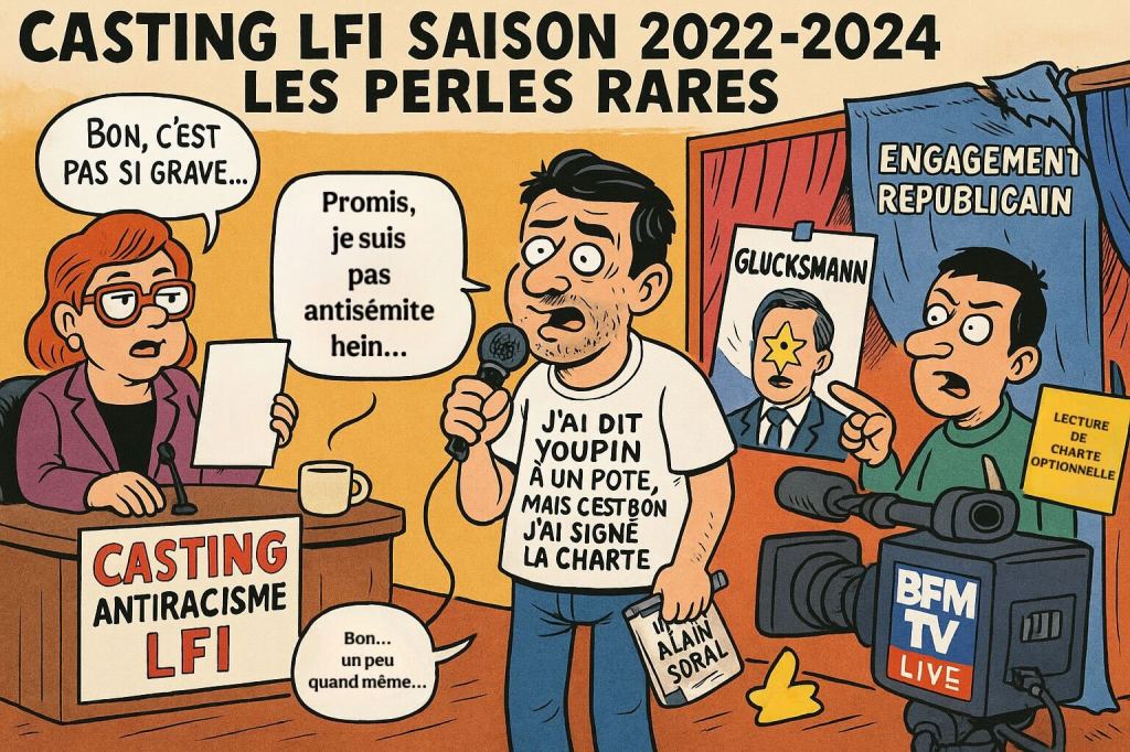 Prenons Reda Belkadi, par exemple. En juin 2024, juste avant des élections législatives partielles, on découvre qu’en 2018 ce fin penseur twittait fièrement qu’il avait traité « un pote juif de youpin » en classe. Une anecdote charmante, surtout lorsqu’elle est suivie de citations enthousiastes d’Alain Soral, le YouTuber de l’extrême droite antisémite en chef. Belkadi ? Éjecté. LFI annonce son exclusion immédiate en rappelant que chaque candidat avait signé une charte s’engageant à « rejeter tous les propos et comportements antisémites ». Il paraît que lire la charte était facultatif.