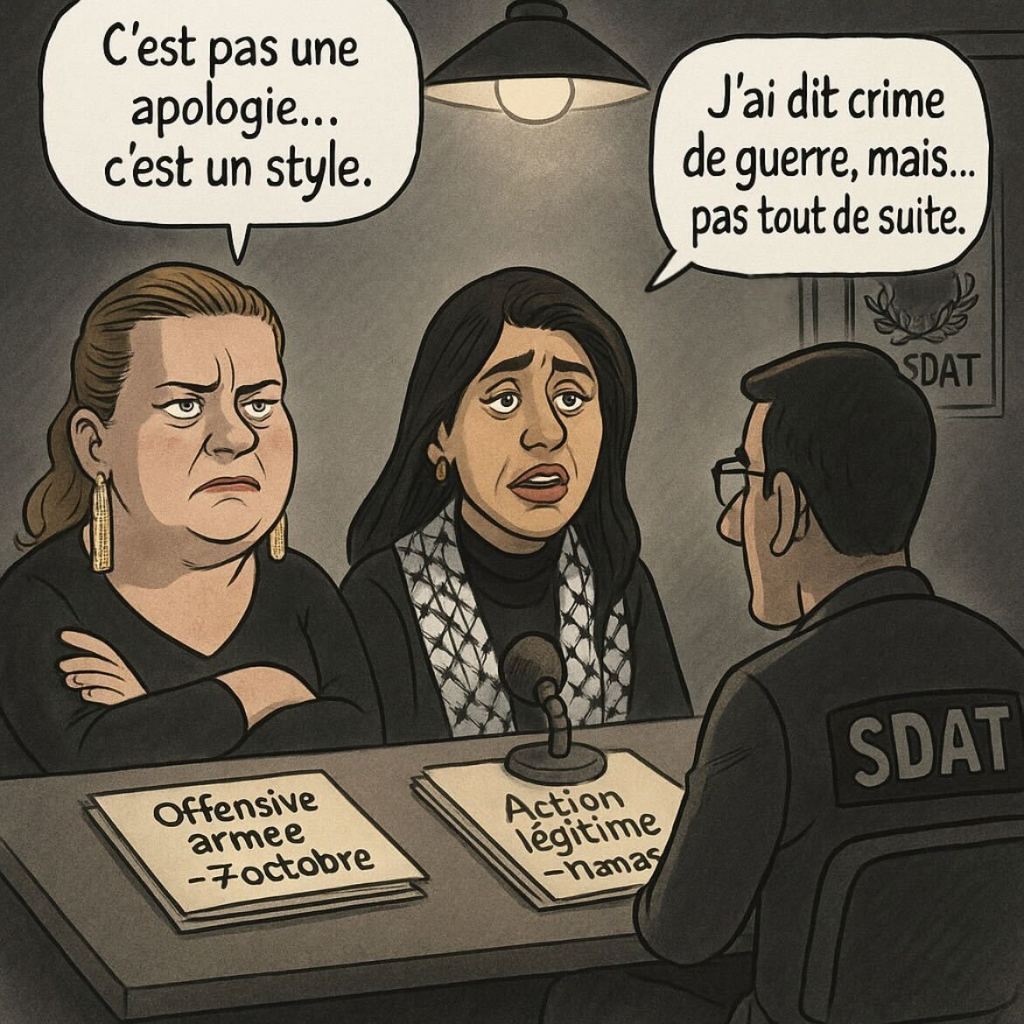 En parallèle, Rima Hassan est, elle aussi, convoquée. Toujours pas élue, mais déjà dans le viseur de la SDAT pour une déclaration de novembre 2023 dans laquelle elle estimait que « le Hamas mène une action légitime ». Selon elle, la vidéo virale a été tronquée, et elle présente à la police une version complète où elle qualifie bel et bien les attaques du 7 octobre de « crimes de guerre ».
