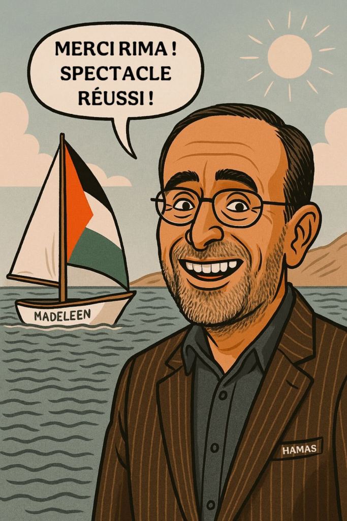 Et pour finir, la cerise sur le bateau : notre chère humaniste en chef, Rima Hassan. Elle ne commande pas, elle ne rame pas, elle ne distribue rien — mais elle est là. Drapée dans sa légitimité de députée européenne fraîchement élue, figée au centre du cadre comme un argument moral en mouvement.